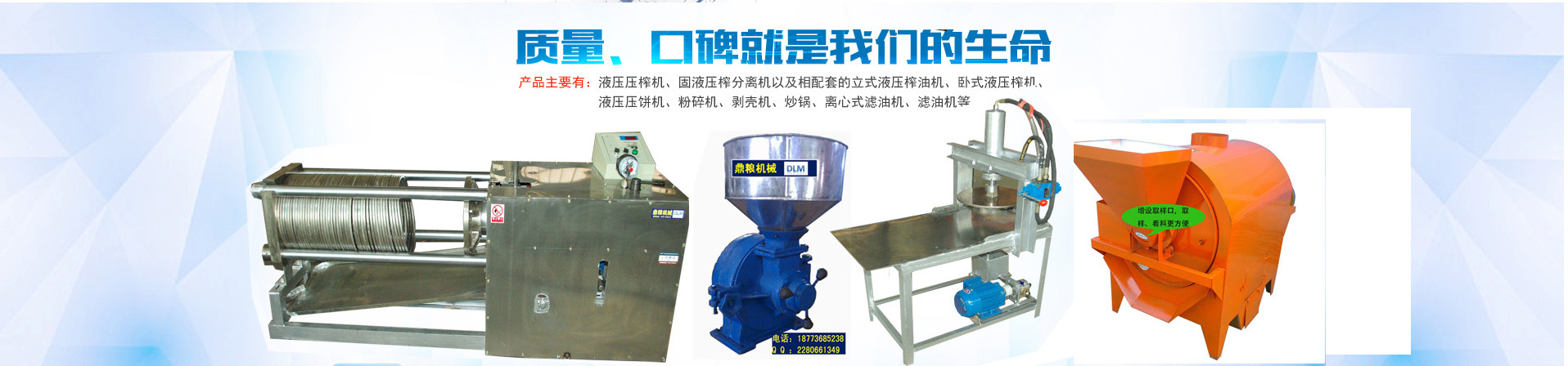 產(chǎn)品主要有:液壓壓榨機、固液壓榨分離機,以及相配套的立式液壓榨油機、臥式液壓榨油機、液壓壓餅機、名類粉碎機、剝殼機、帶灶滾筒炒鍋、榨油輔助設備、各種類型濾油機、液壓泵站、壓力機整機及其配件等。